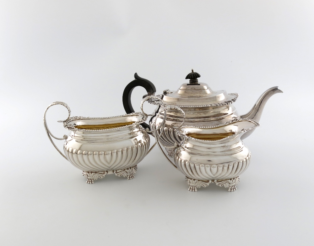 oblong bellied form, part fluted decoration, shell and gadroon borders, scroll handles, on four winged paw feet, length handle to spout 28.5cm, approx. weight 39oz. (3)