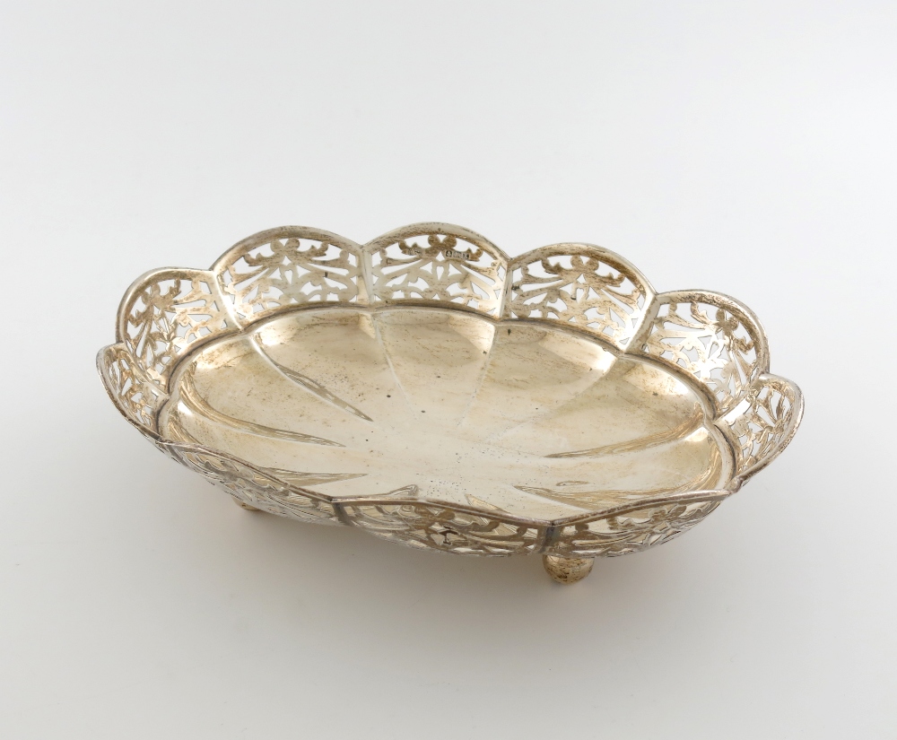 shaped oblong form, pierced foliate scroll decoration, on four ball feet, length 27cm, approx. weight 11.5oz.
