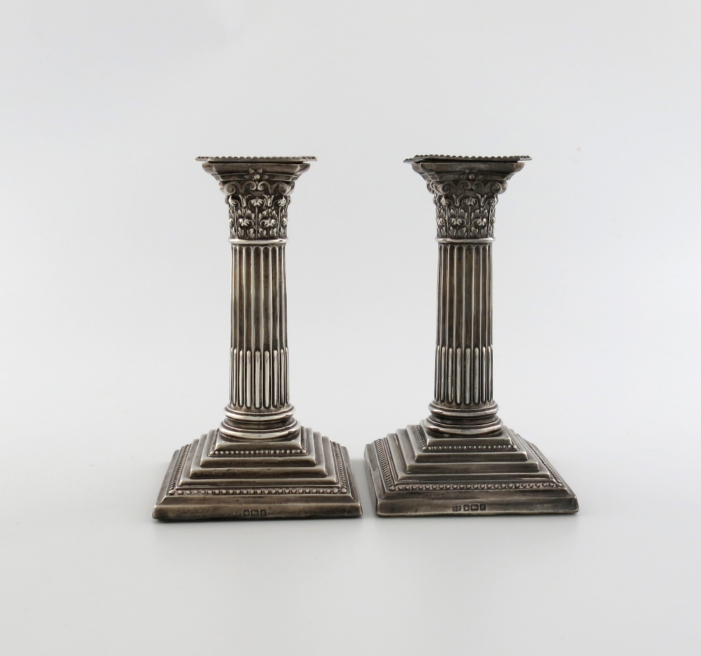Corinthian column form, beaded borders, on stepped square bases, height 14.5cm. (2)