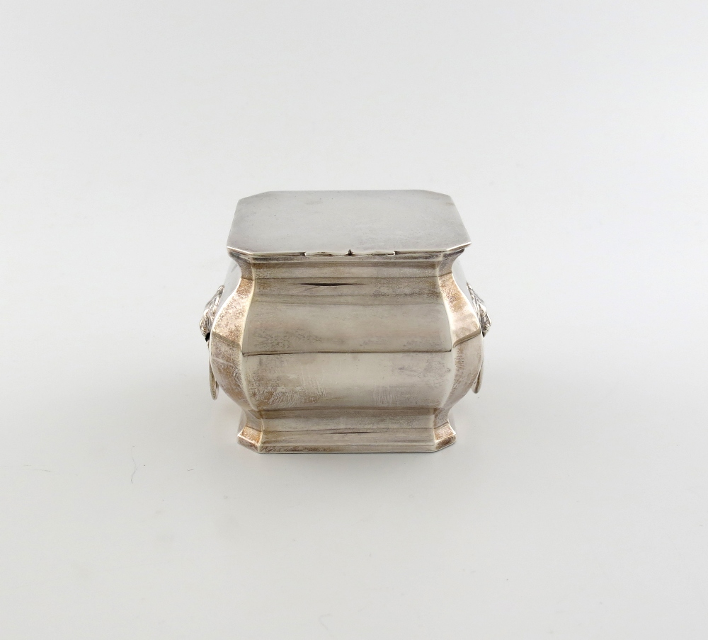 square cushion form, hinged cover, with two lion mask drop ring handles, gilded interior, height 7.8cm, approx. weight 8.5oz.
