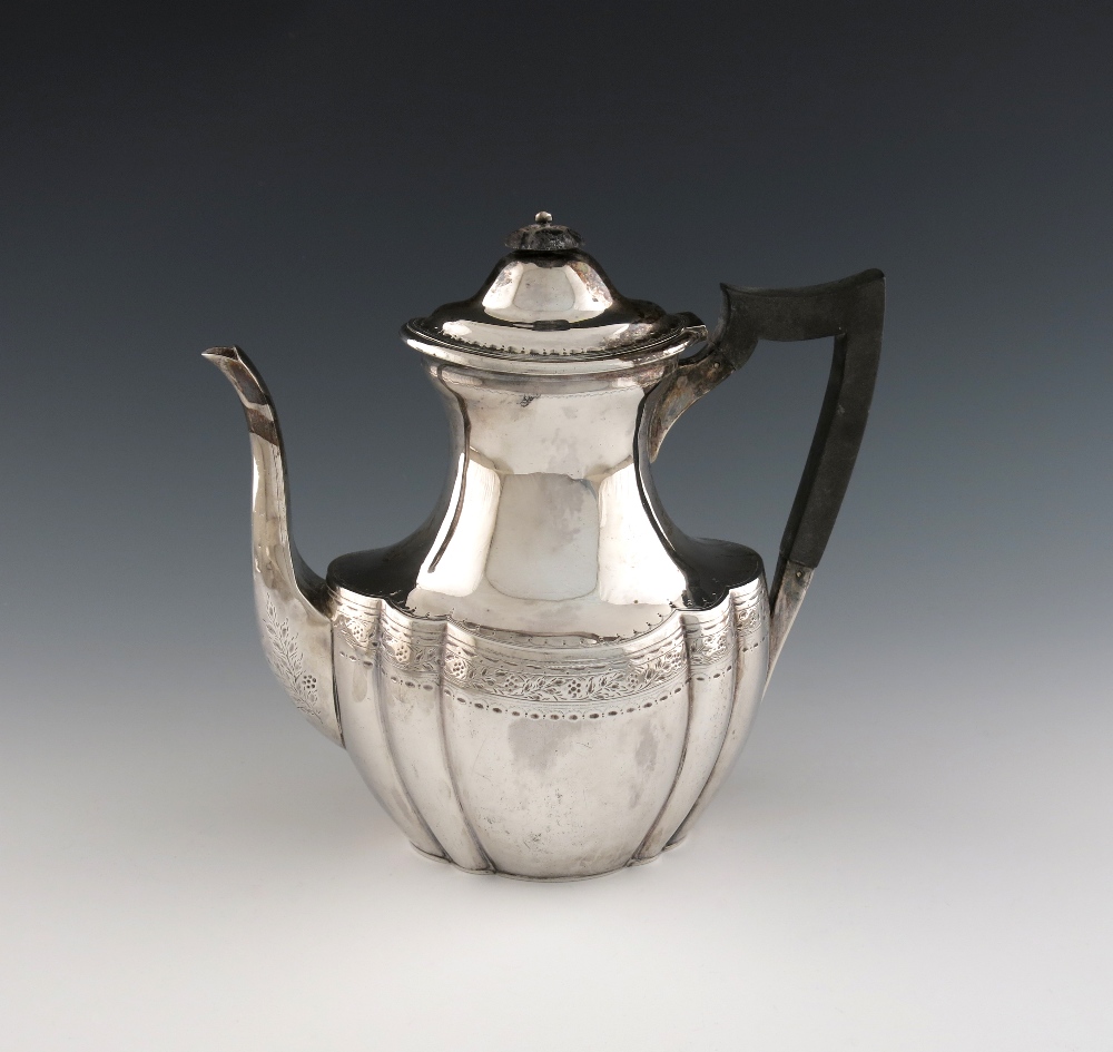 lobed oval form, engraved decoration, scroll handle, domed hinged cover, height 20cm, approx. weight 15oz.