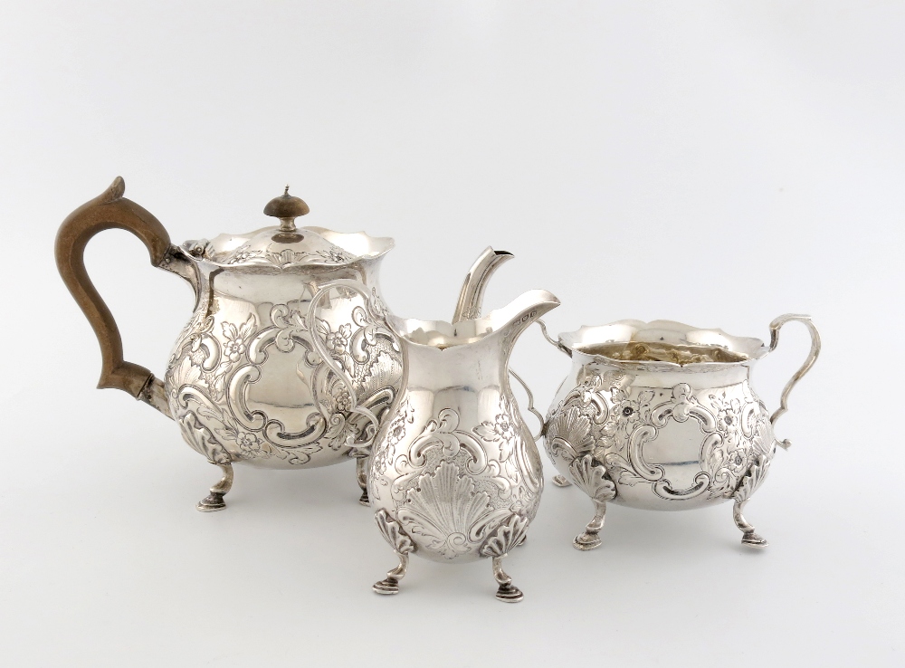 circular bellied form, embossed foliate scroll decoration, domed hinged cover with a knop finial, scroll handles, on four hoof feet, approx. weight 36oz. (3)