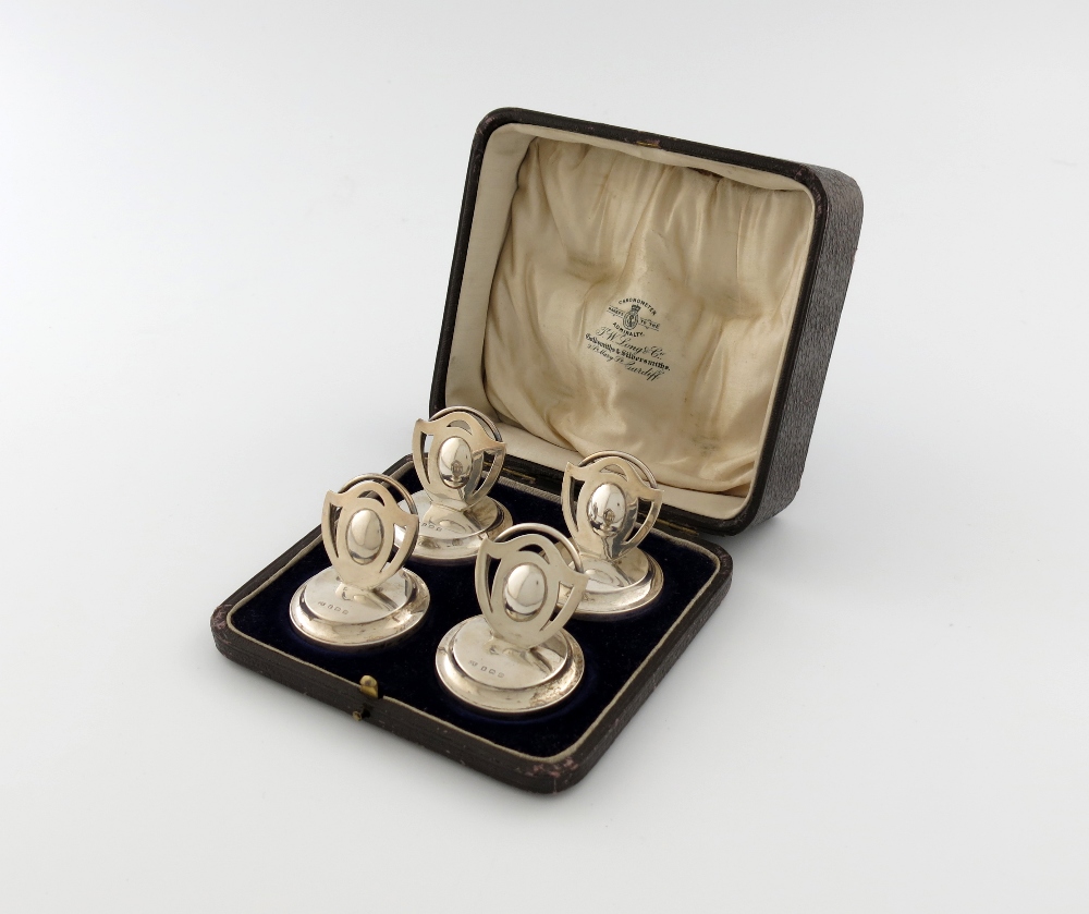 A set of four silver and enamel menu card holders