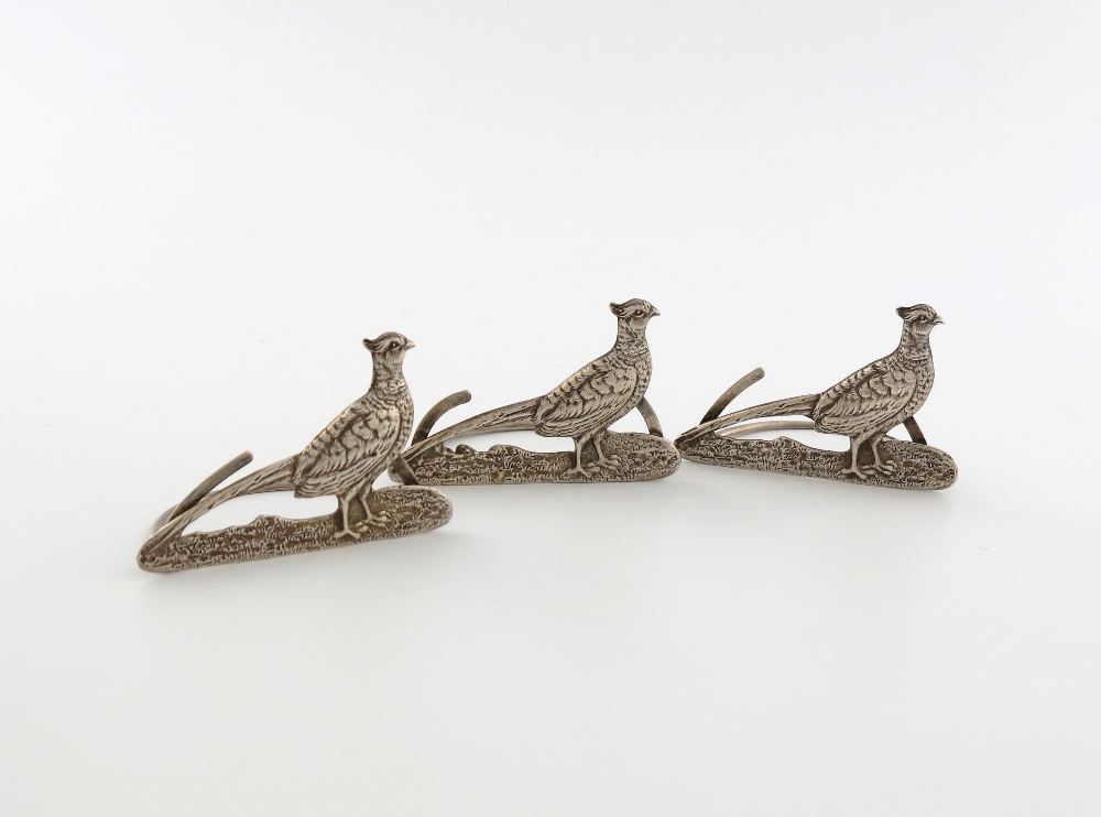 modelled as standing pheasants, semi-circular wire-work supports, length 6.4xm, approx. weight 1.7oz. (3)