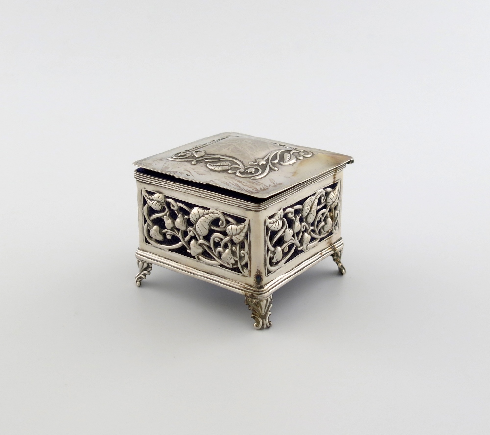 square form, the sides with pierced foliate decoration, hinged cover, velvet lined, on four bracket feet, length 6cm.