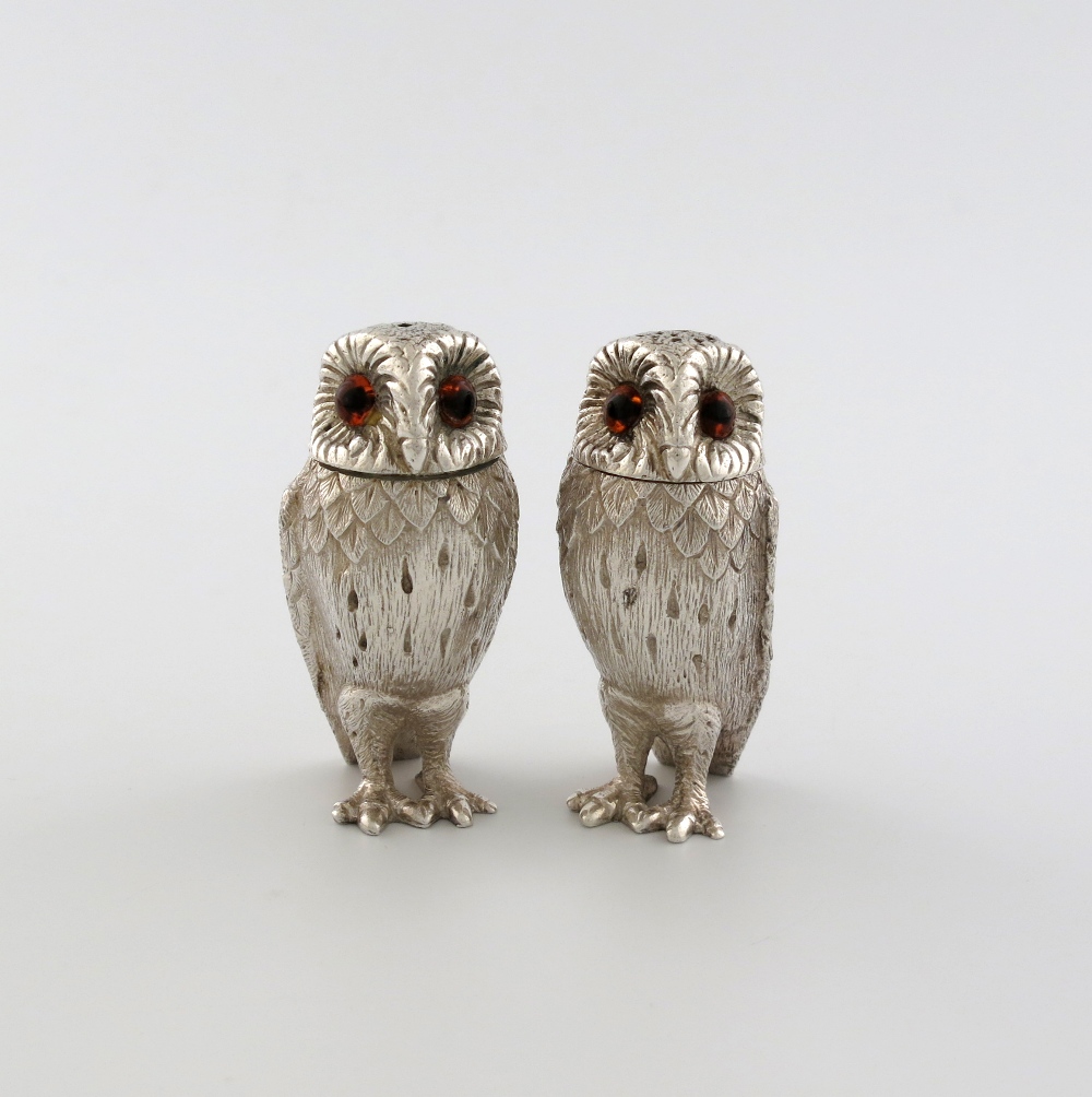 modelled as standing owls, the pull-off heads set with glass eyes, height 7.3cm, approx. weight 7oz. (2)