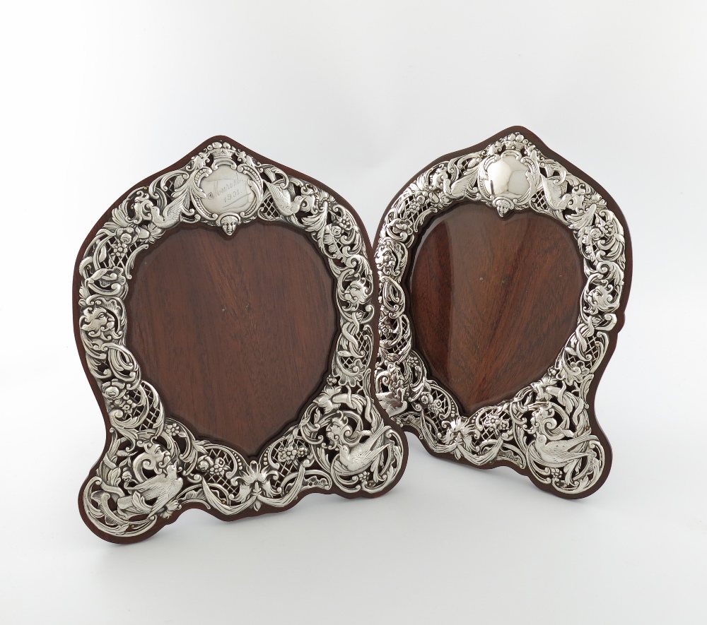 arched upright form, heart shaped aperture, embossed and pierced with birds, trellis and foliate scroll decoration, one inscribed 'Muriel 1901', replacement easel backs, height 28.7cm. (2)
