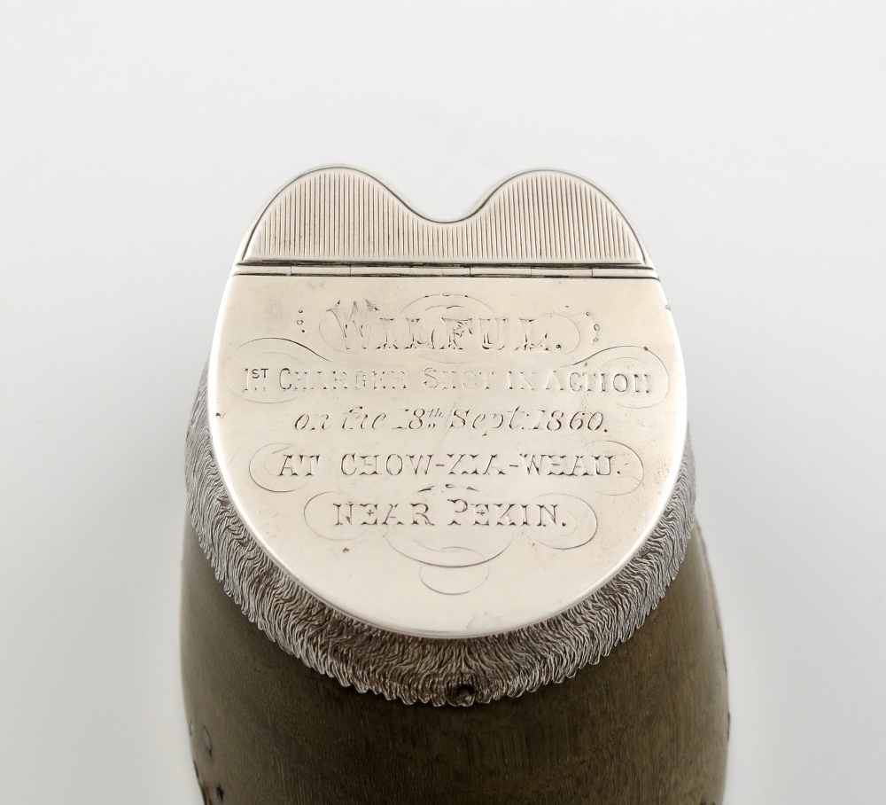 the hoof with textured hair mounts and a striking plate, the hinged cover inscribed 'WILFUL, 1st Charger Shot in Action on the 18th September 1860 AT CHOW-KIA-WHAU NEAR PEKIN', on a silver horse shoe, length 12cm.