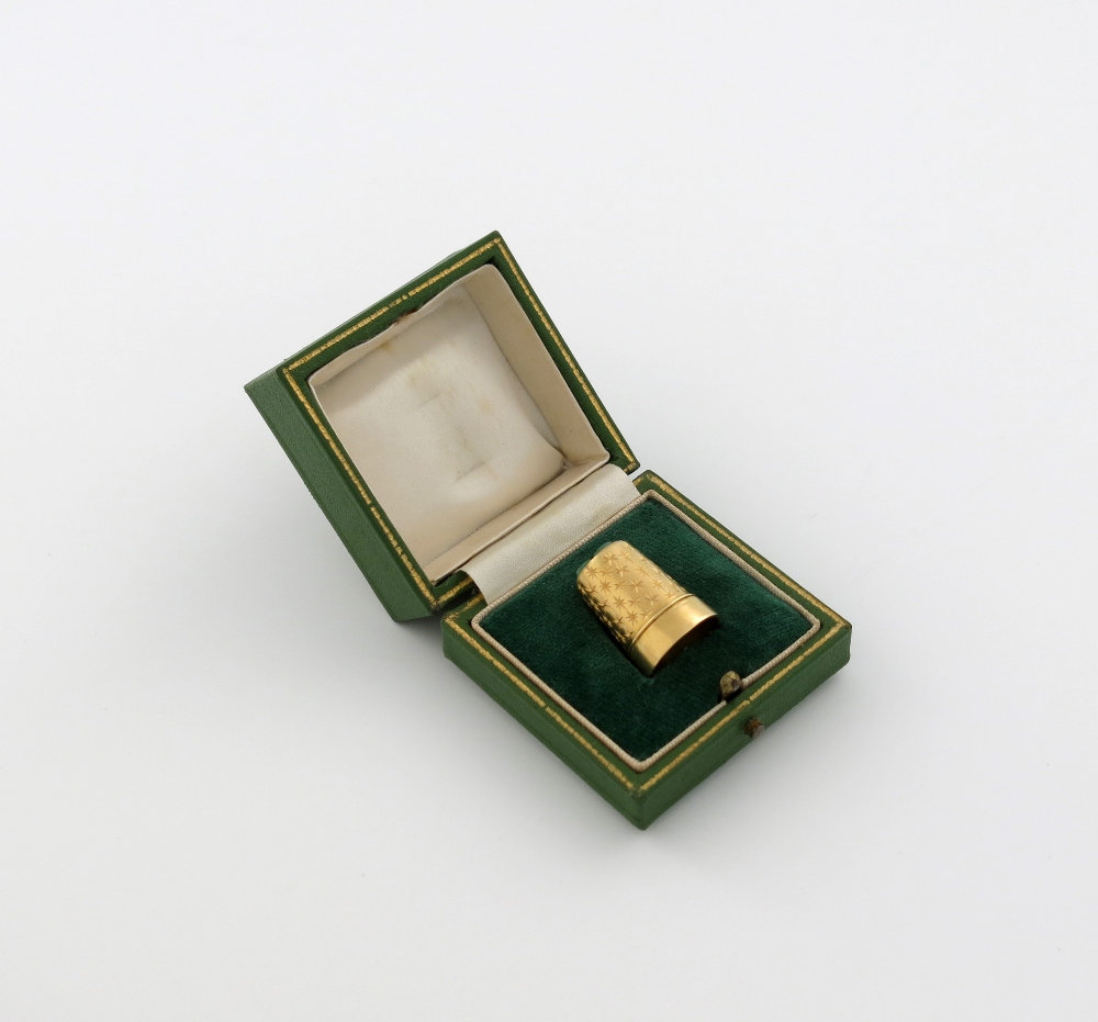 tapering circular form, engraved star decoration, with a green hard stone terminal, in a fitted case, height 2.3cm, approx. total weight 8g.