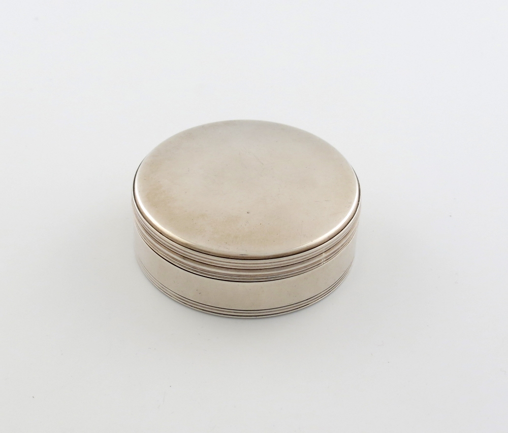 circular form, pull-off cover, gilded interior, reeded border, diameter 8.1cm, approx. weight 5oz.