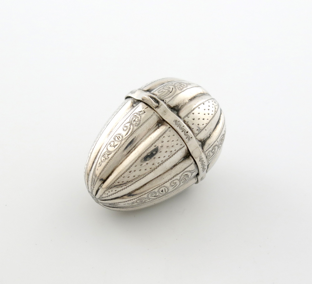 of fluted egg form, engraved decoration, hinged cover, length 5cm, approx. weight 0.9oz.