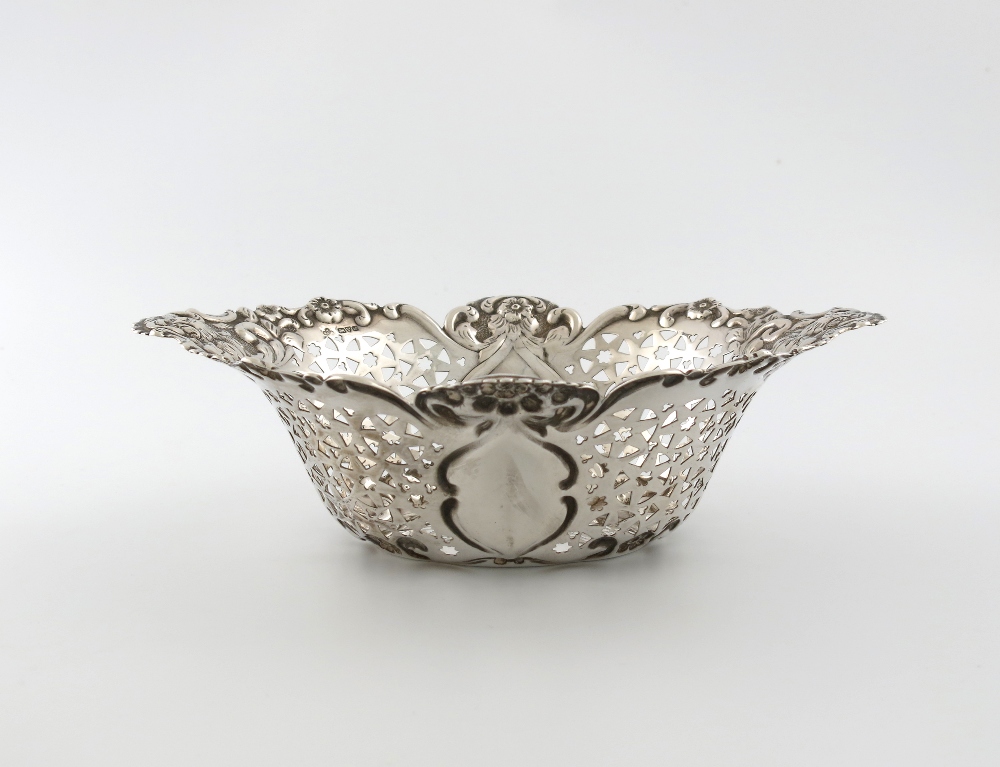 oval form, pierced decoration, foliate scroll border, length 27.2cm, approx. weight 11oz.