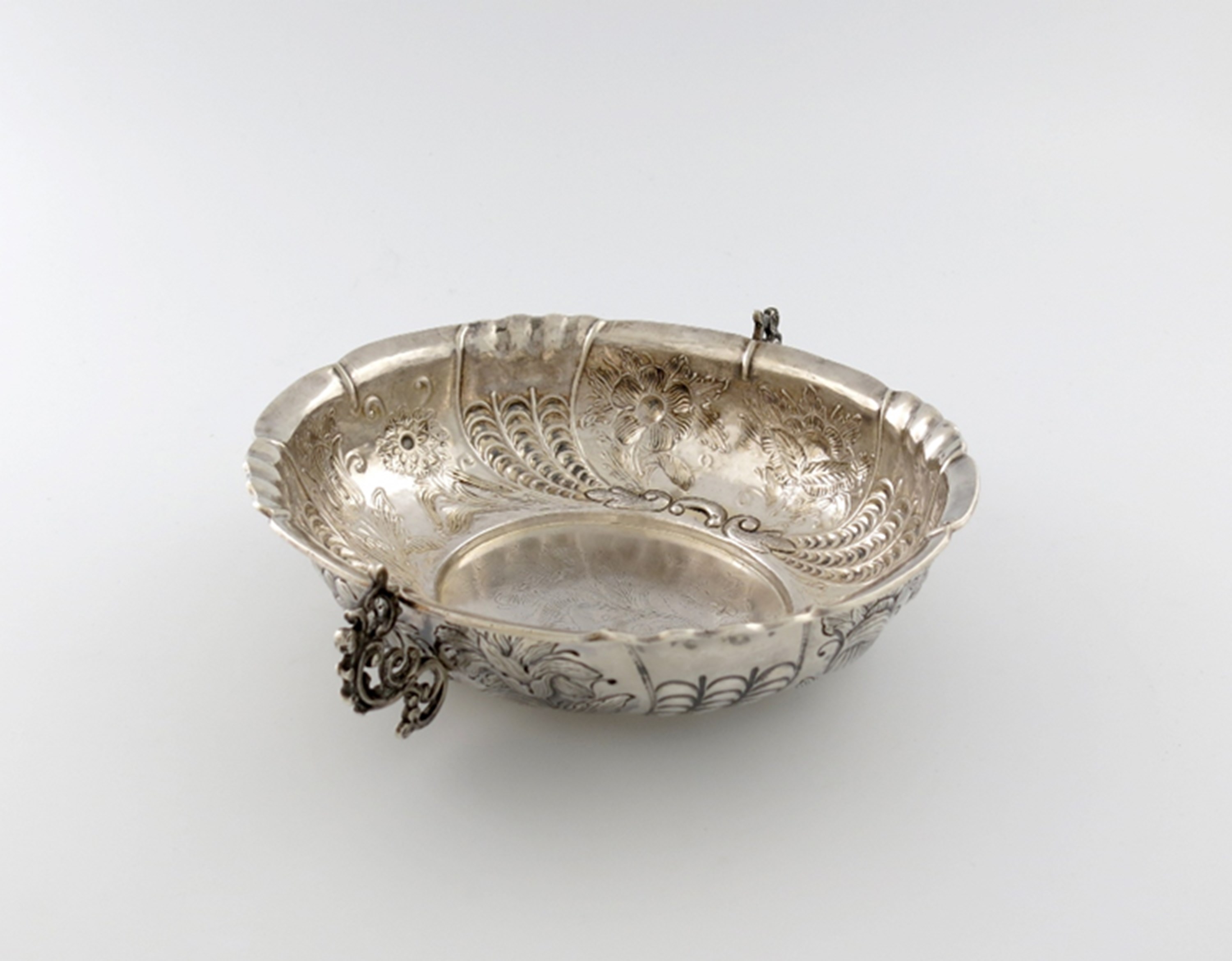oval form, pierced scroll handles, embossed with foliate decoration in the late-17th century manner, length 25.3cm, approx. weight 15.9oz.