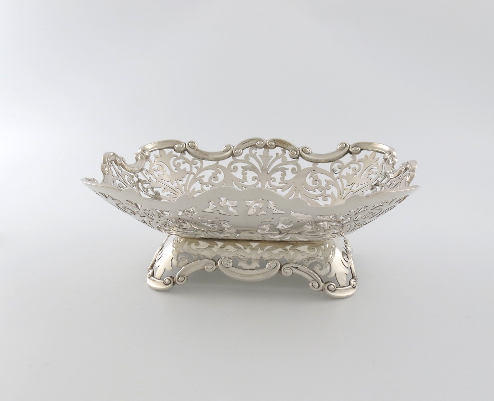 rectangular form, pierced foliate scroll decoration, scroll border, on a raised pierced scroll border, length 24.8cm, approx. weight 18oz.