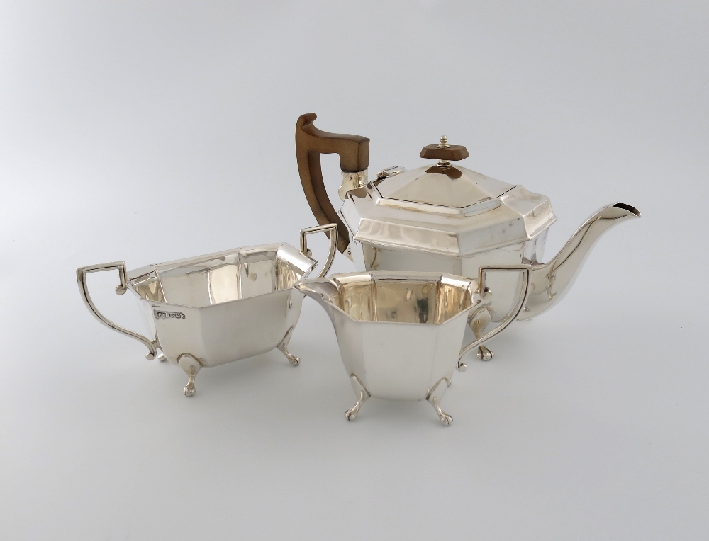 octagonal form, on paw feet, with angular handles, hinged cover, approx. weight 31oz. (3)