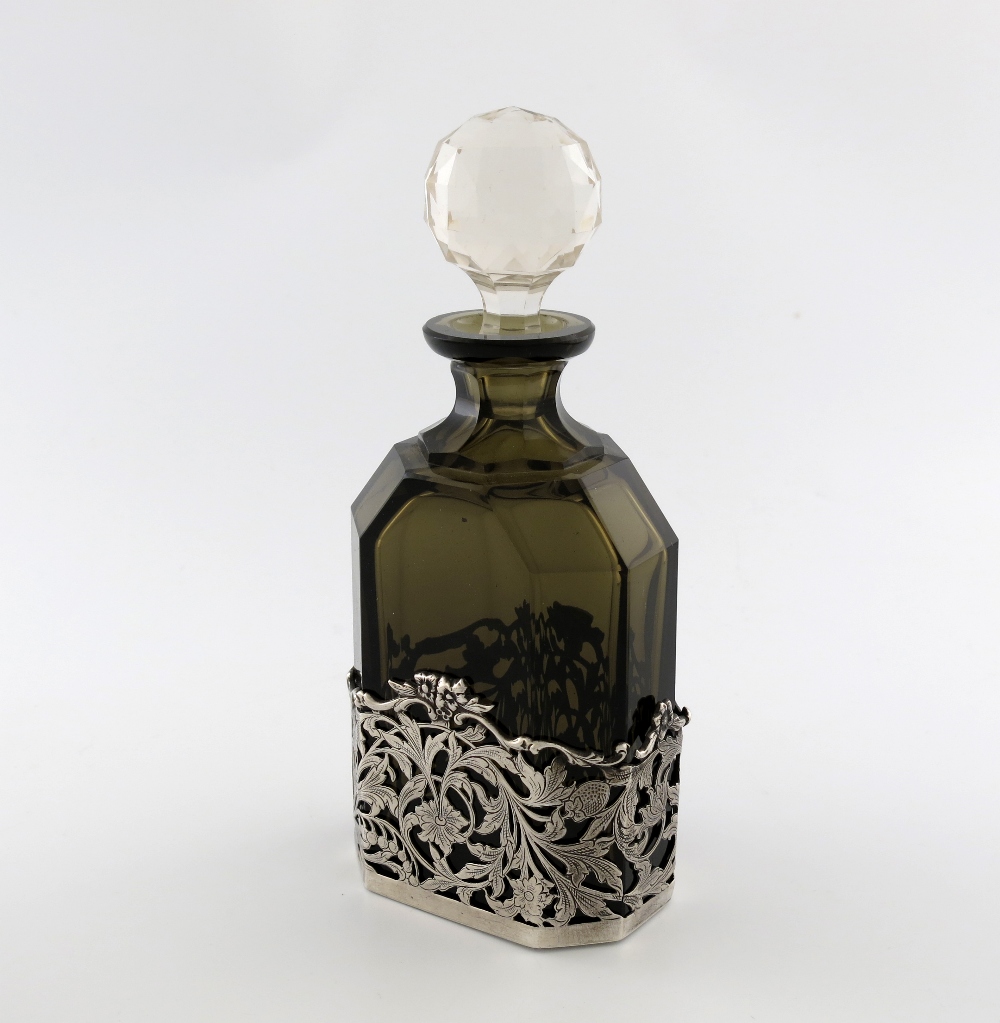 rectangular form, canted corners, the sleeve with engraved foliate scroll decoration, height 23.5cm, approx. weight 4oz.