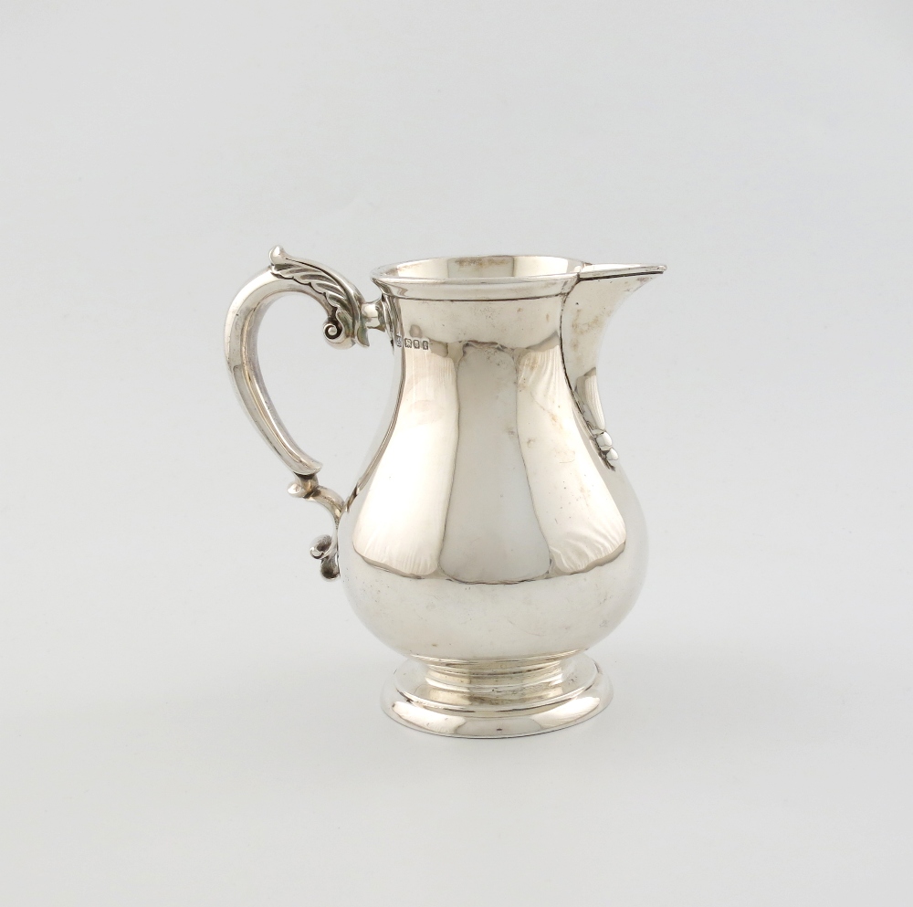 baluster form, leaf capped scroll handle, on a raised circular foot, height 15cm, approx. weight 13oz.