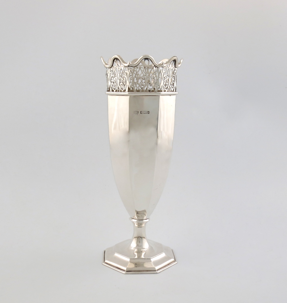 tapering octagonal form, pierced foliate frieze, on a raised octagonal base, height 26cm, approx. weight 13.5oz.