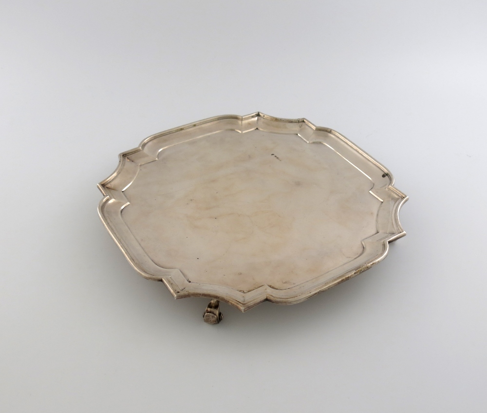 square form, canted corners, moulded border, on four gnarl feet, diameter 30.8cm, approx. weight 31oz.