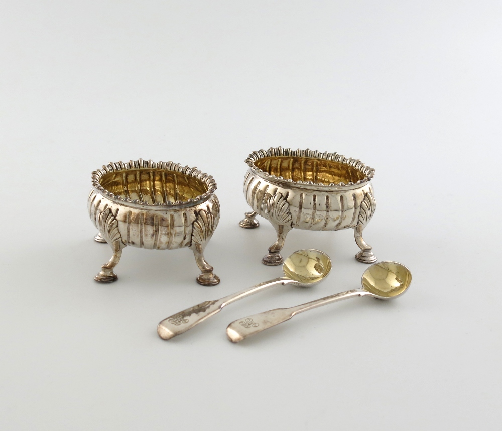 oval fluted form, gadroon border, gilded bowls, on four shell capped hoof feet, plus two George III Fiddle pattern salt spoons, London 1817, approx. weight 7oz. (4)