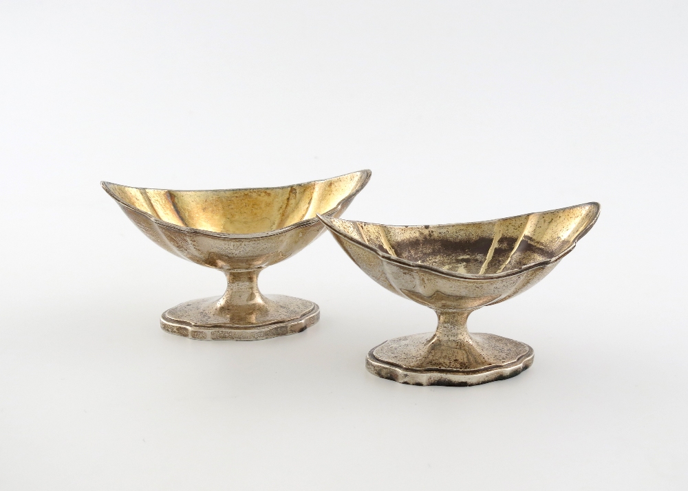 shaped oval form, gilded bowls, on shaped raised oval bases, length 11cm, approx. weight 5.5oz. (2)
