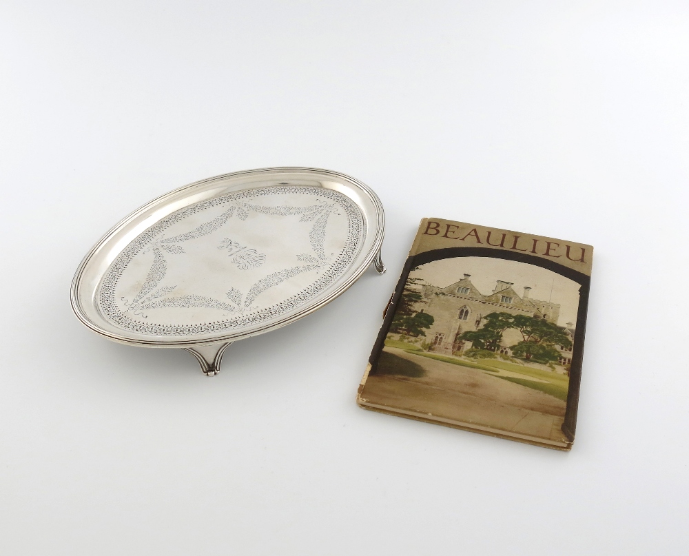 oval form, engraved decoration, reeded border, engraved with a crest and monogram, on four bracket feet, the underside later inscribed 'To George Richardson Esq. from Lord Henry J.M.D Scott as a token to esteem and regard on his resignation of the agency of the Beaulieu Estate October 1877', length 23cm, approx. weight 11.5oz.
