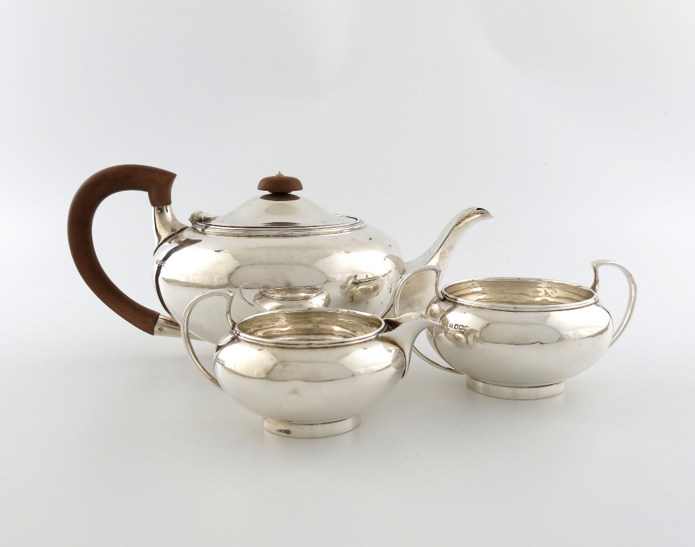 compressed circular form, scroll handles, the teapot with a domed cover and knop finial, length handle to spout 27.3cm, approx. weight 28oz. (3)