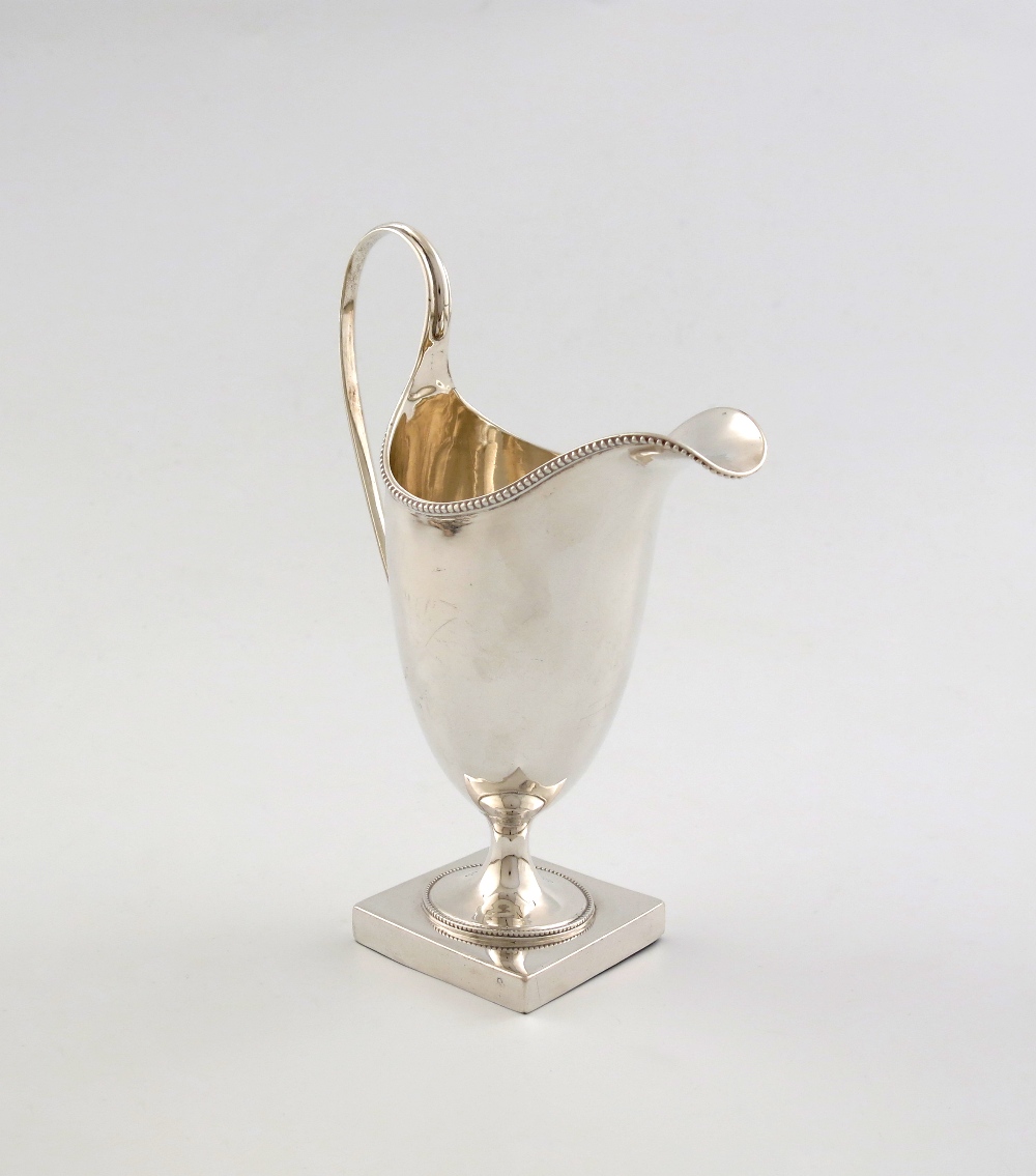 helmet form, reeded handle, beaded borders, on a raised square foot, height 16cm, approx. weight 3.5oz.