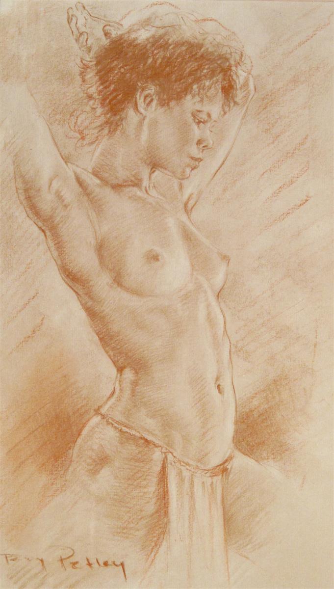 ‡Roy Petley (b.1950) A female nude with arms raised Signed Red chalk 39 x 23cm With a signed