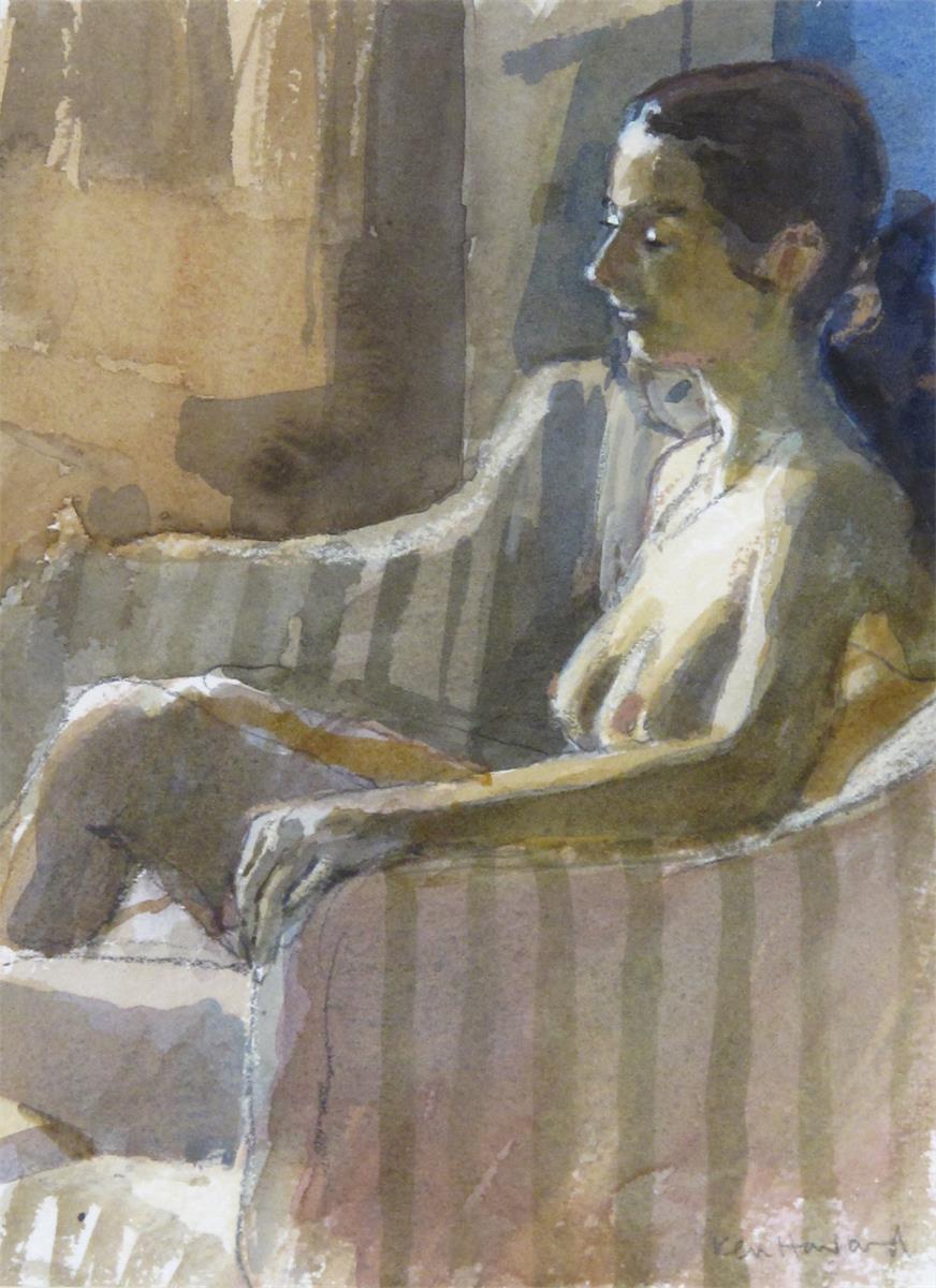 ‡Ken Howard R.A. (b.1932) Female nude seated on a striped sofa Signed Watercolour 23 x 17cm; 9 x...