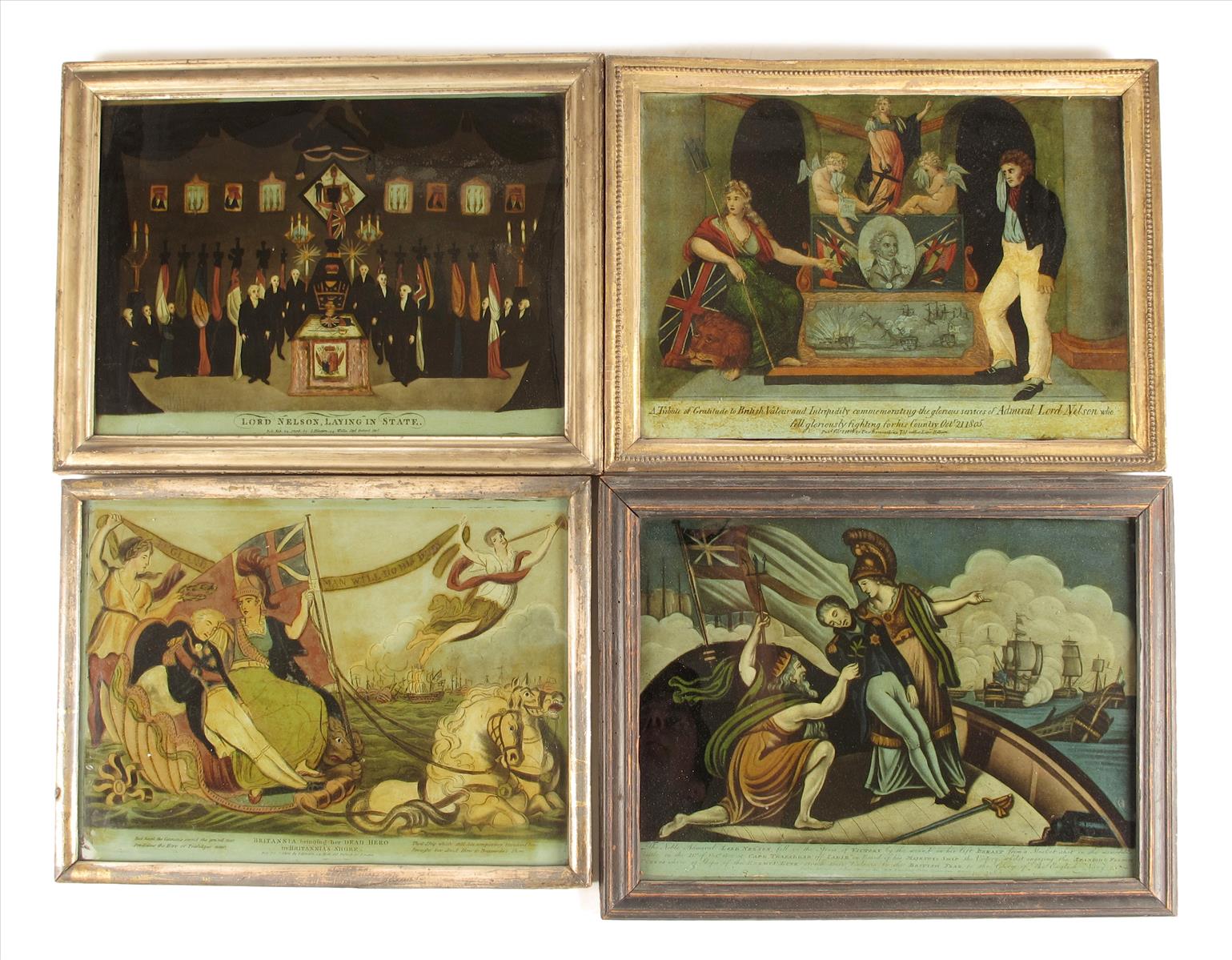 Four early 19th century Nelson commemorative reverse glass pictures, 'The Noble Admiral LORD NELSON fell in the Arms of VICTORY by the wound in his left BREAST from a Musket shot in the memobrable Battle on the 21st Octr. 1805 at CAPE TRAFALGAR off CADIZ.....' London. publifhed by P. Gally Novr. 25. 1805. No.7. Beauchamp Street, Leather Lane, Holborn. 10¼ x 13¾in (25.8 x 35.2cm); 'LORD NELSON, LAYING IN STATE.' Pub. Feb. 24. 1806, by I. Hinton, 44, Wells Strt. Oxford Strt.; 'BRITANNIA brining her DEAD HERO to BRITANNIA'S SHORE.', also published by I. Hinton; 'A Tribute of Gratitude to British Valour and Intrepidity, commemorating the glorious services of Admiral Lord Nelson who fell gloriously fighting for his Country, Octr 21 1805.', Pubd Feby 1. 1806 by Peter Barnaschina 73 Leather Lane Holborn. (4)