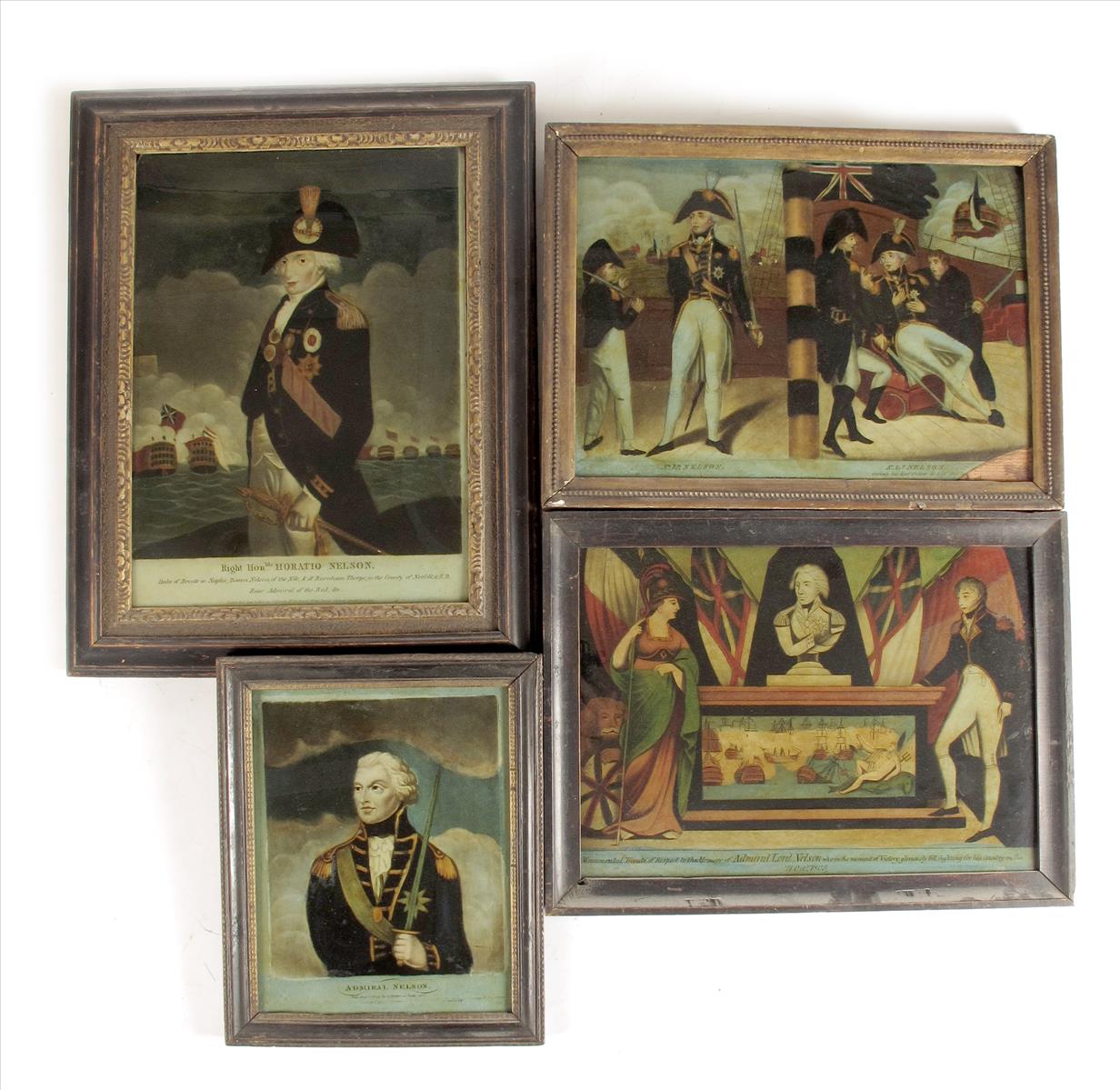 Four early 19th century Nelson commemorative reverse glass pictures, 'Right Honble. HORATIO NELSON. Duke of Bronte in Naples, Baron Nelson, of the Nile, & of Burnham-Thorpe, in the County of Norfolk, & K.B. Rear Admiral of the Red, &c.', 'Published Dec,1,1800, by I. Hinton No. 44, top of Well Street, Oxford Street, London.', 13¾ x 10in (35.1 x 25.2cm); 'ADMIRAL NELSON', 'Pub. Aug. 1. 1805. by I. Hinton 44 Wells Strt.'; 'AD. LD. NELSON. AD. Ld. NELSON Giving his last Orders to Capt. Hardy', 'Pub. May, 18, 1806, by I. Hinton, 14 Wells Strt.'; 'A Monumental Tribute of Respect to the Memory of ADMIRAL LORD NELSON who in the moment of Victory gloriously fell fighting for his Country on the 21 Octr. 1805.', 'Pubd. Jan. 20. 1806, by W. B. Walker, Fox & Knot Cot., Snow Hill, London.'. (4)