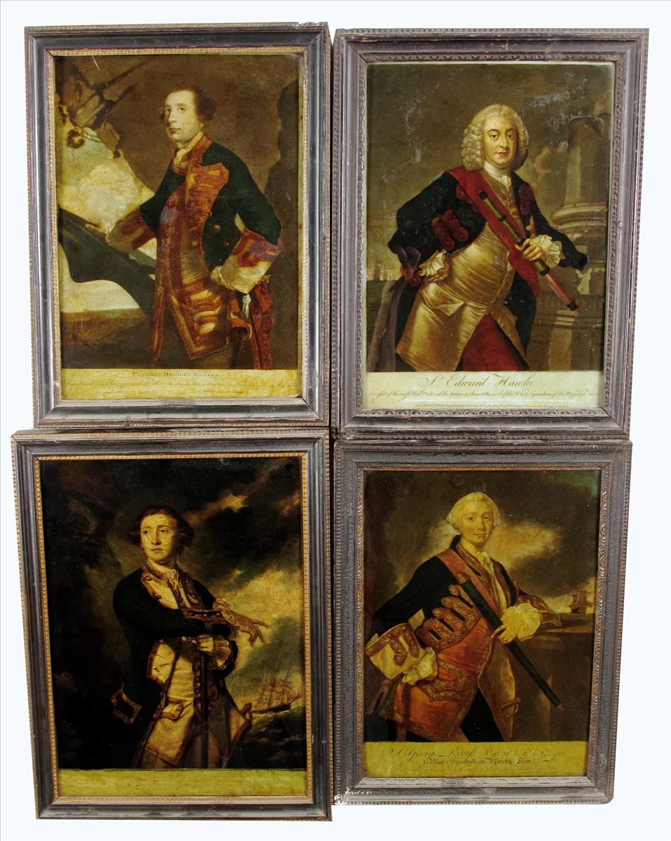 Four George III reverse glass pictures of 18th century Navy Admirals, 'Sr. GEORGE BRIDGES RODNEY.' 14 x 10in (35.7 x 25.3cm), 'Sr. Edward Hawke', 'Sold by JOHN EYNON, Map & Print-feller, at y Corner of Castle Alley, Royal Exchange in Threadneedle STREET, LONDON.'; 'Sr. George Pocock.', 'Publish'd March 25th 1762, Printed for John Banks & Son at the Black Horse, Cornhill.'; and an untitled portrait. (4)