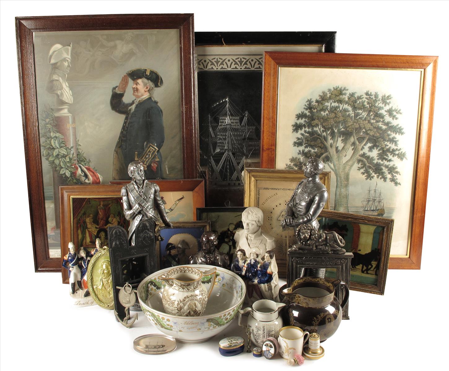 Nelson interest. An early 19th century brown glazed pearlware jug, printed with portraits of Lord Nelson and Lord Collingwood, 5¾in (14.3cm) high, 8in (20.2cm) wide, a pearlware and silver lustre jug, printed with a bust of Lord Nelson, the reverse with a list of the fleet, with the number of guns, a moulded pearlware jug and a green glazed oval plaque. (4)