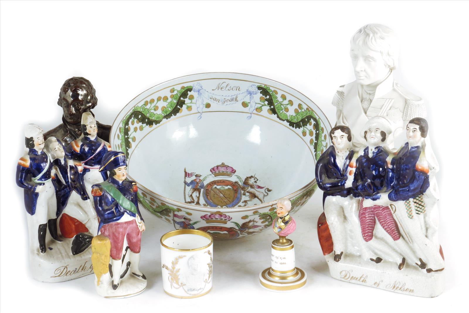 Nelson interest. A 19th century brown glazed and silver lustre pottery bust of Lord Nelson, 8¾in (22cm) high, a parian bust of Nelson after John Flaxman, the reverse impressed 'R & L' for Robinson and Leadbetter; a Derby porcelain bust of Nelson, the base with his dates; three Staffordshire pottery models, two titled 'Death of Nelson'; a Samson bowl in the Nelson Service pattern and a porcelain mug with an applied bisque bust of Wellington, titled. (8)