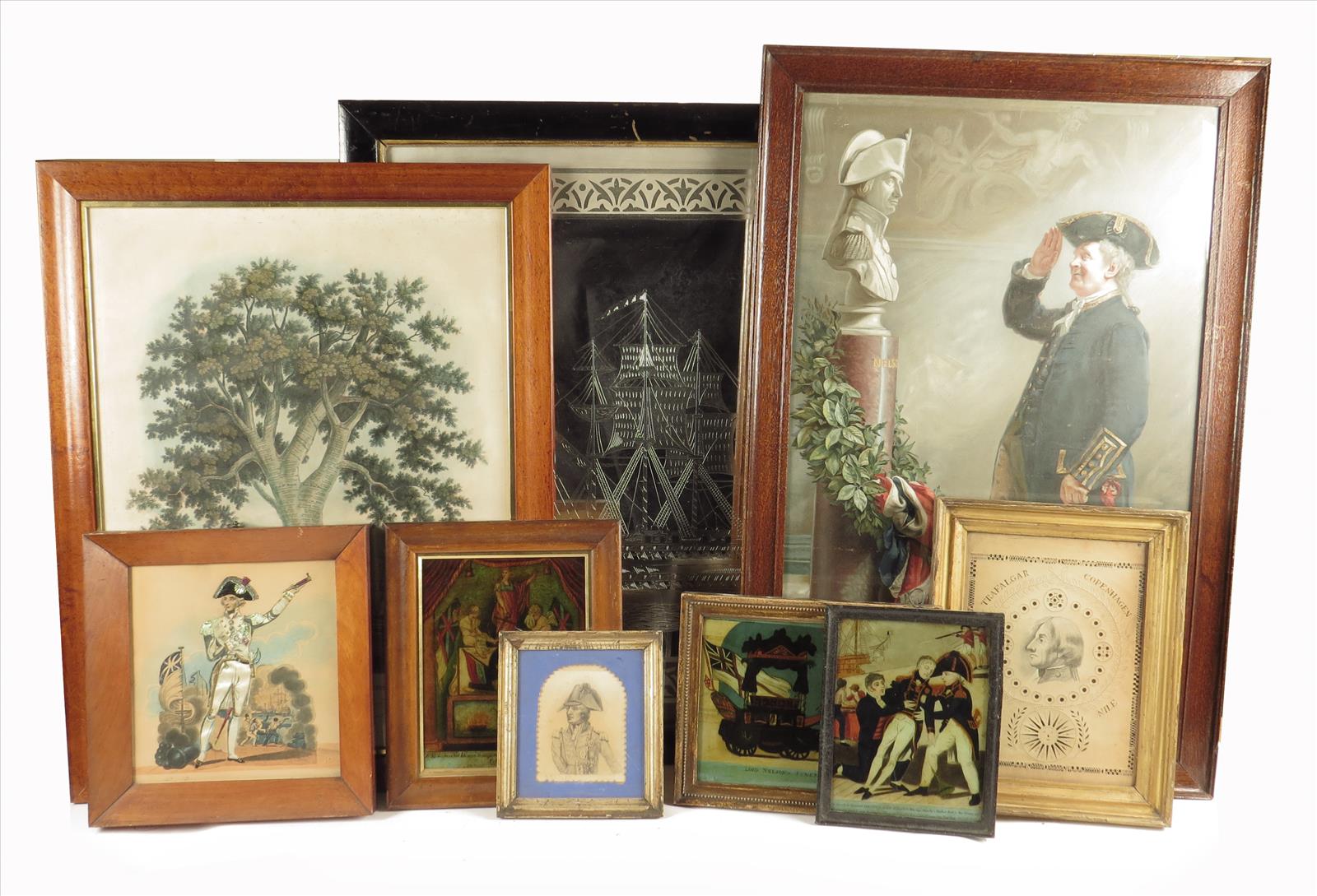Nelson interest: Three 19th century reverse glass pictures, 'The Ever-to-be Lament'd DEATH of LORD NELSON, Who was Shot by a Mufket Ball in the Brave & GLORIOUS VICTORY over the Combin'e Fleets, of FRANCE & SPAIN, NEAR Cape Trafalgar Oct. 21. 1805', 8½ x 6½in (21.2 x 16cm), 'LORD NELSON'S FUNERAL CAR', 'A Monumental Design to perpetuate the Memory of Lord Nelson who Fell Octr. 21 1805', 'Pub. June 1, 1806 by P. Barnaschina, 43 Leather Lane, Holborn'; 'Genealogical Tree of British Naval Victors', etching and coloured aquatint, designed by H. Innes and engraved by James Egan, 'London, 1841, Published by I. W. Laird, 1 Leadenhall Street', 24¼ x 18in (61.7 x 45.5cm), in a bird's eye maple frame; a cut-paper picture engraved with a profile bust of Nelson, 'TRAFALGAR, COPENHAGEN, THE NILE', with a mirror back; a collage picture of Nelson, with printed and silkwork elements; a Pears print 'SALUTING THE ADMIRAL', a mirror picture engraved 'H.M.S. Victory' and a pencil sketch of Nelson, signed 'J. W. Devis'. (9)