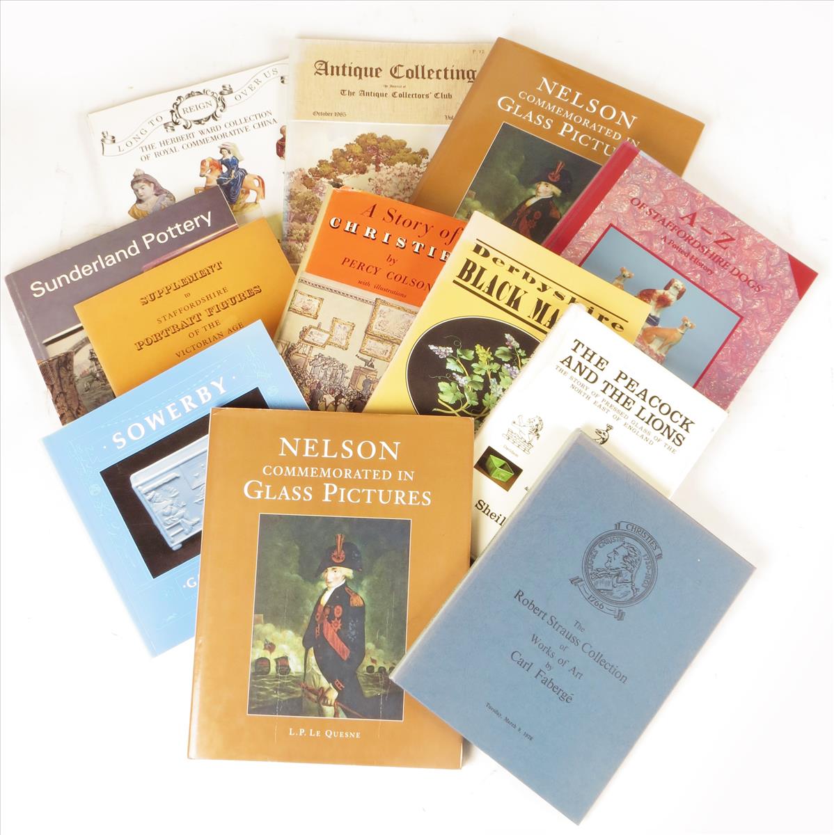 Literature: A small collection of books relating to antiques, to include: L. P. Le Quesne 'Nelson Commemorated in Glass Pictures'; John C. Baker 'Sunderland Pottery', John Michael Tomlinson 'Derbyshire Black Marble', Christie's 'The Robert Strauss Collection of Works of Art by Carl Fabergé', London, 9th March, 1976; 'Sowerby, Gateshead Glass'. (12)