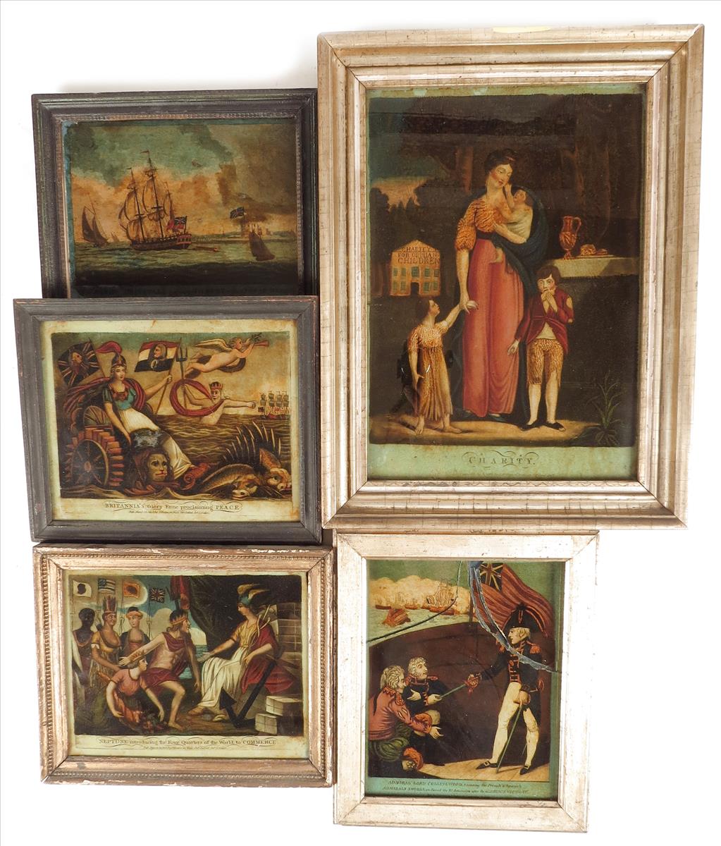Five late 18th / early 19th century reverse glass pictures, 'NEPTUNE introducing the Four Quarters of the World to COMMERCE', 'Pub. March 14, 1803 by I. Hinton 44, Wells Strt. Oxford Strt. London.' 7¼ x 9¼in (18.4 x 23.4cm); 'The ACTIVE PRIVATEER pafsing TILBURY with a FRESH BREEZE', 'Published March 19th 1796, by Haines & Son. Rolls Buildings London'; 'BRITANNIA'S Glory Fame proclaiming PEACE' 'Pub. March 14, 1803, by. I. Hinton, 44, Wells Strt. Oxford Strt. London.'; 'CHARITY', 'Published Sep. 1. 1804, by I. Hinton, 44, Wells Strt. Oxford Strt.'; 'ADMIRAL LORD COLLINGWOOD, receiving the French & Spanish ADMIRALS SWORDS. on Board the Rt. Sovereign after the GLORIOUS VICTORY.', 'Pub. Decr. 16.1805, by P. Patriarcha, Leather Lane, London.'. (5)