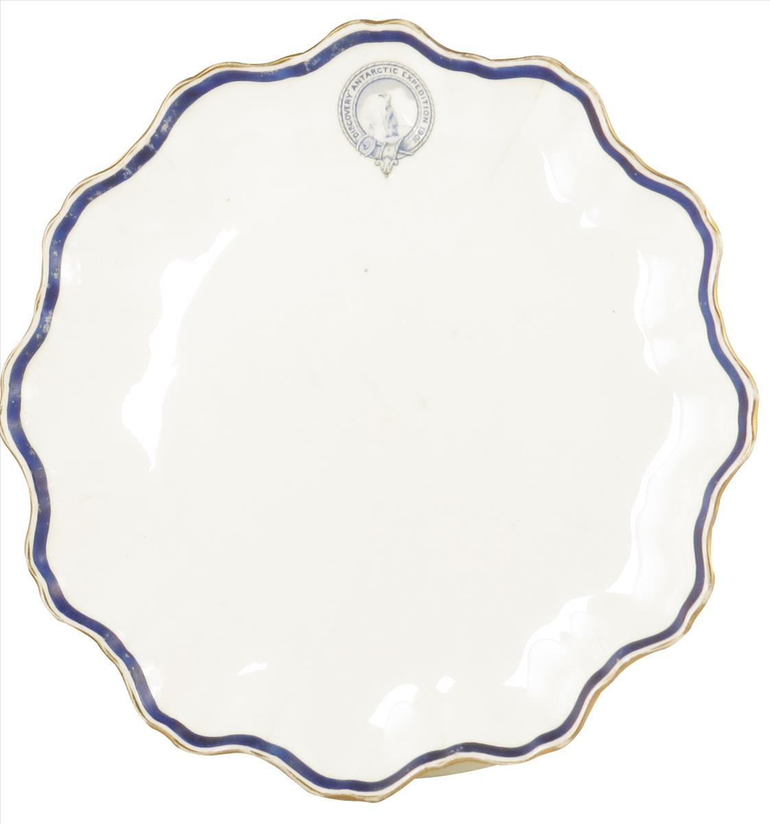 Antarctic interest. A Doulton earthenware scalloped edge plate from the wardroom of H.M.S. Discovery, with a gilt edge and blue band, marked 'DISCOVERY ANTARCTIC EXPEDITION 1901' with a penguin garter, the reverse with green printed Doulton Burslem mark 'Rd. No. 72067', 9in (23cm) wide.