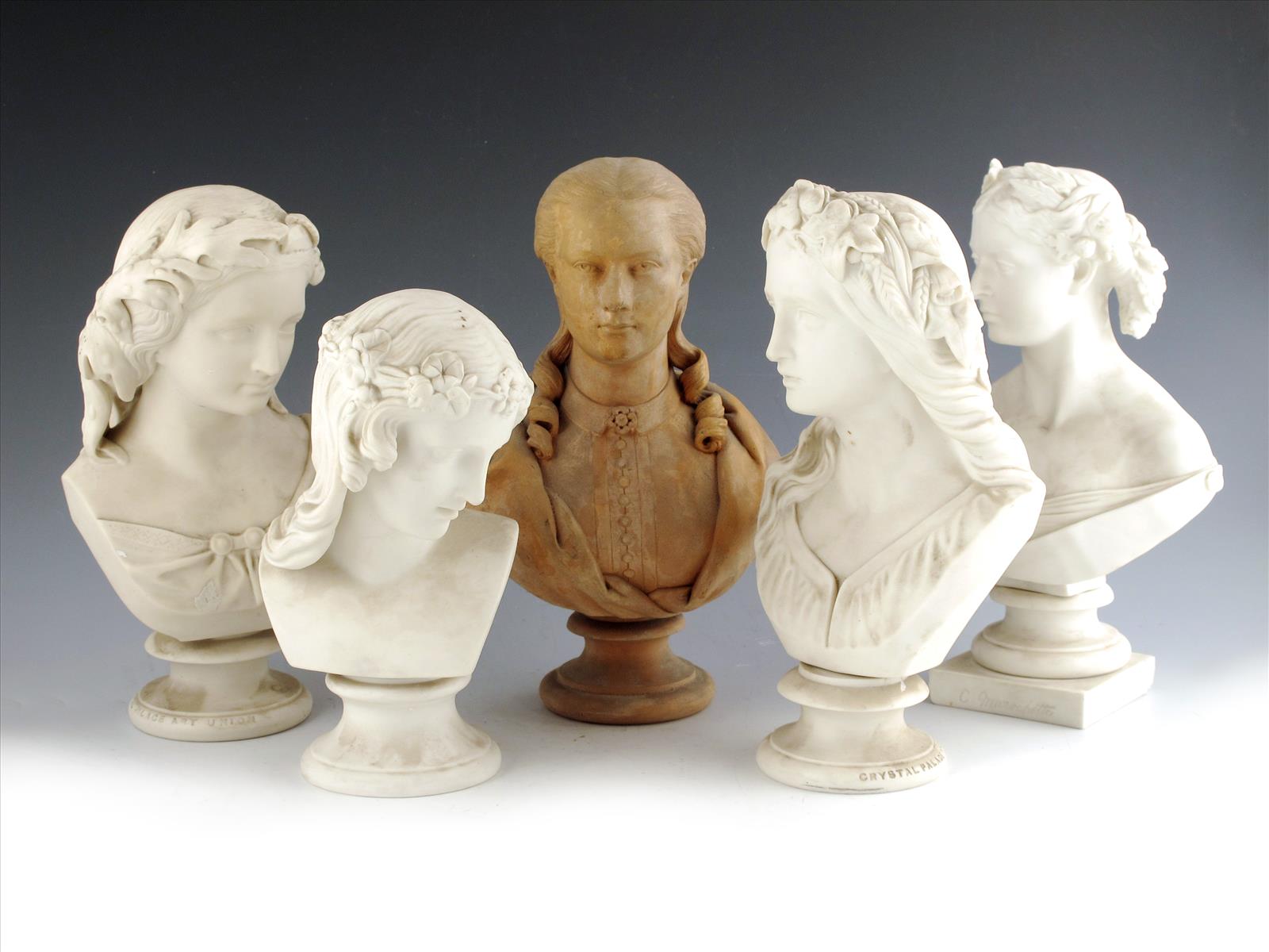 A pair of Victorian Copeland parian bust of Miranda and Ophelia, sculpted by W. C. Marshall for the Crystal Palace Art Union, impressed marks, 11in (27.7cm) high, a Minton parian bust of the young Queen Victoria, sculpted by C. Marochette, signed with impressed marks; a terracotta bust of a lady by Josh Pitts, 1864 and a parian bust of a lady, unmarked. (5)