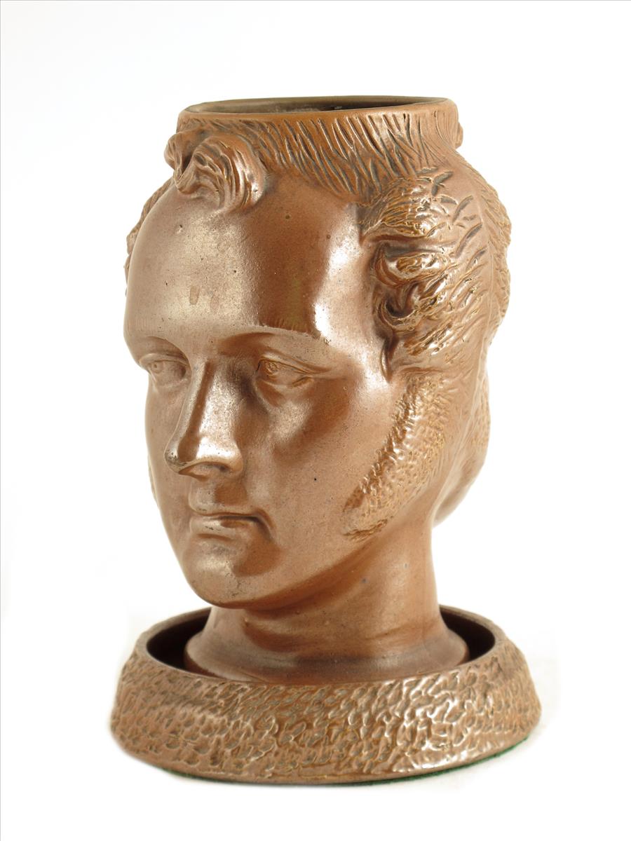 A Victorian pottery janus head jar on stand, modelled with a portrait bust of Prince Albert, 9in (22.5cm) high, 7in (17.7cm) wide. (2)