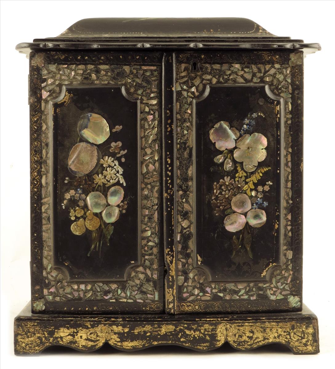 A 19th century papier-mâché table cabinet, inlaid mother of pearl and painted with flowers, the hinged top revealing divisions and two pin cushions above a pair doors enclosing two long drawers, each with divisions the top drawer plush lined for jewellery the other originally with a writing slope, with four further drawers around an arched pigeon hole, with gilt decoration, 15½in (39.3cm) high, 13¼in (33.3cm) wide, 10½in (26.6cm) deep.