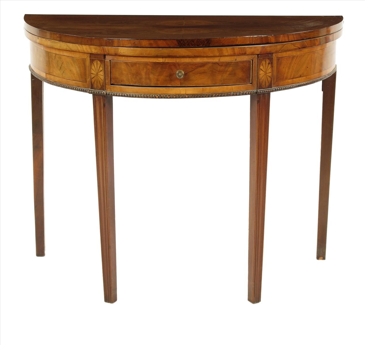 A late 18th century mahogany card table, with inlaid stringing and a frieze drawer, 29in (73.6cm) high, 36in (91.5cm) wide, 17¾in (45cm) deep.