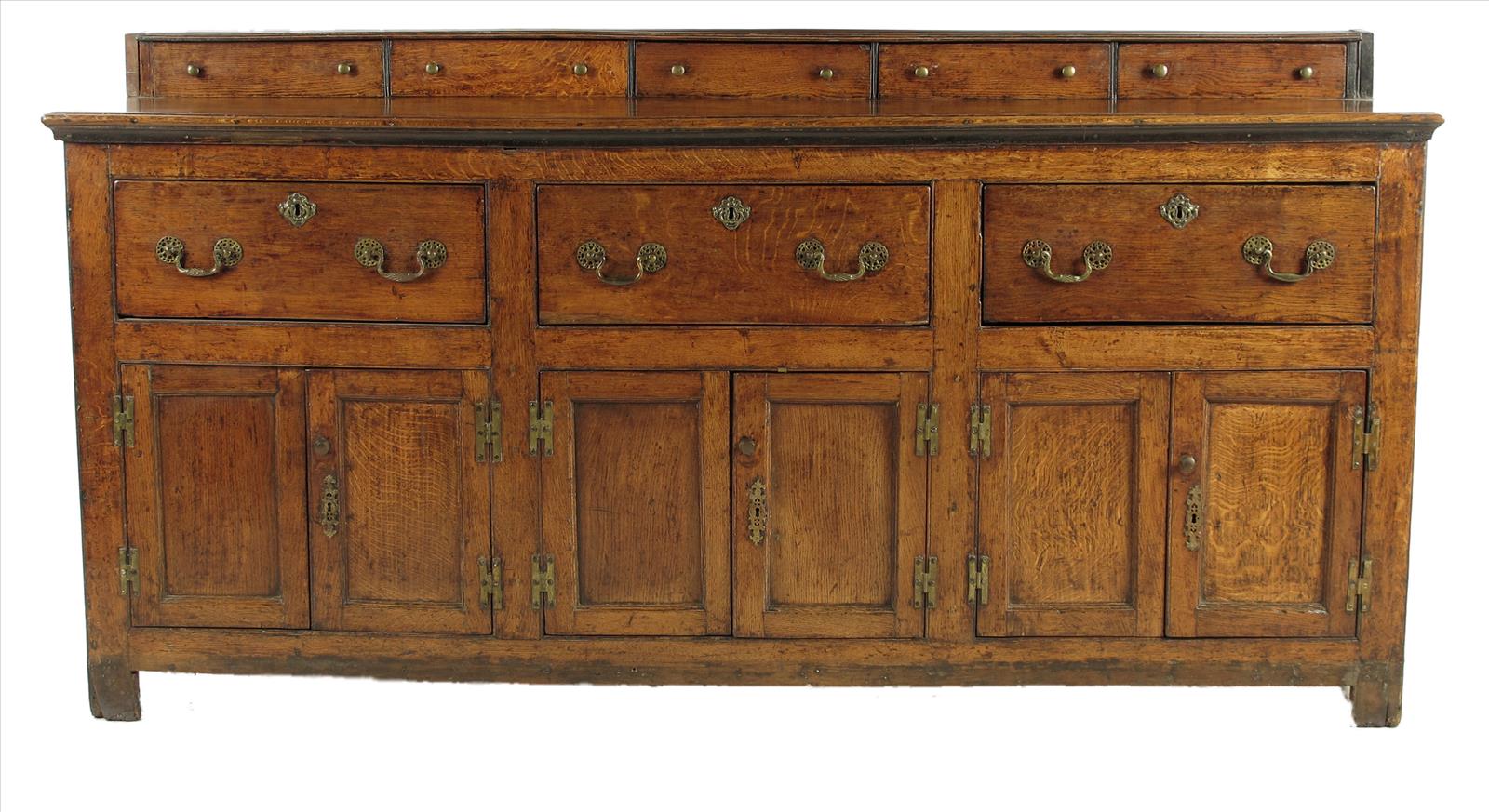 A George III oak dresser, with spice drawers above frieze drawers and three pairs of panel cupboard doors, 39¾in (101cm) high, 79in (200.6cm) wide, 19¾in (50.2cm) deep.