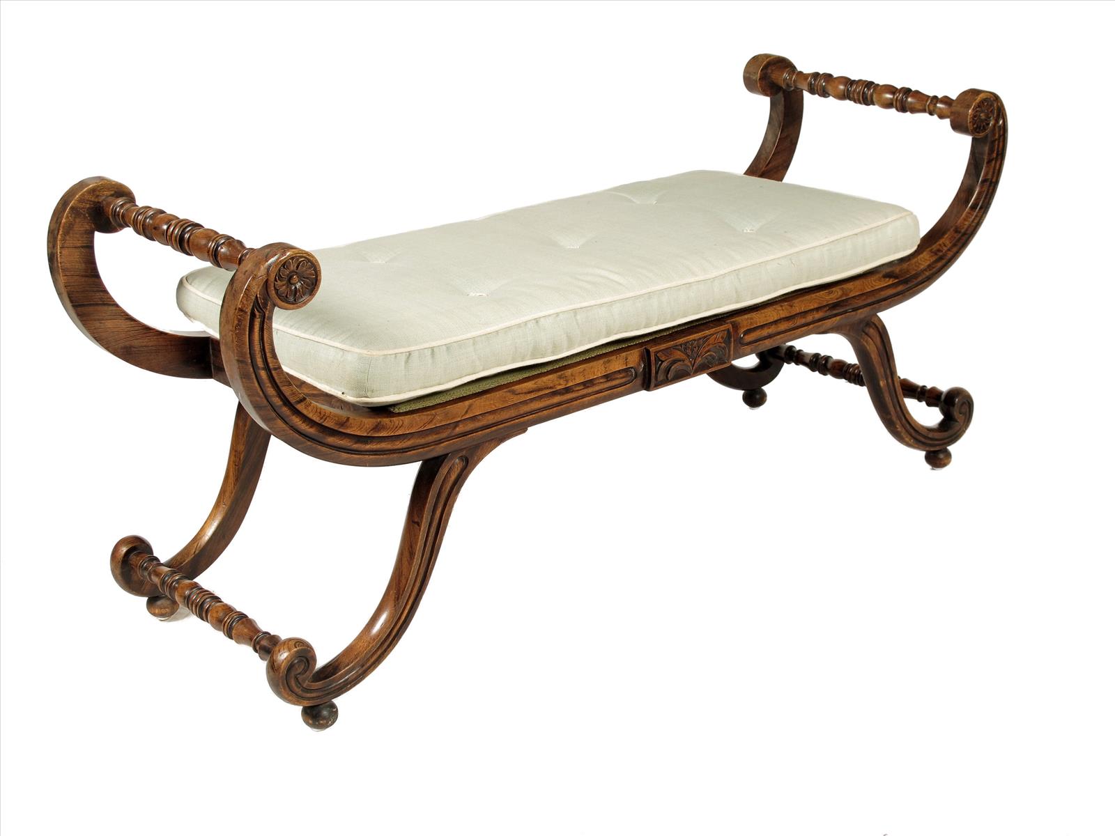 A William IV simulated rosewood scroll end window seat, with a squab cushion, 23¾in (60.3cm) high, 53in (134.6cm) wide, 17¾in (45cm) deep.