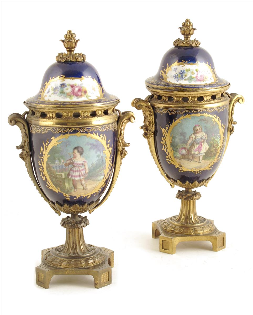 A pair of late 19th century French Sevres style porcelain urns and covers, with gilt metal mounts, painted with panels of flowers and a young boy and girl, 12in (30.3cm) high, 6in (15.2cm) wide. (2)