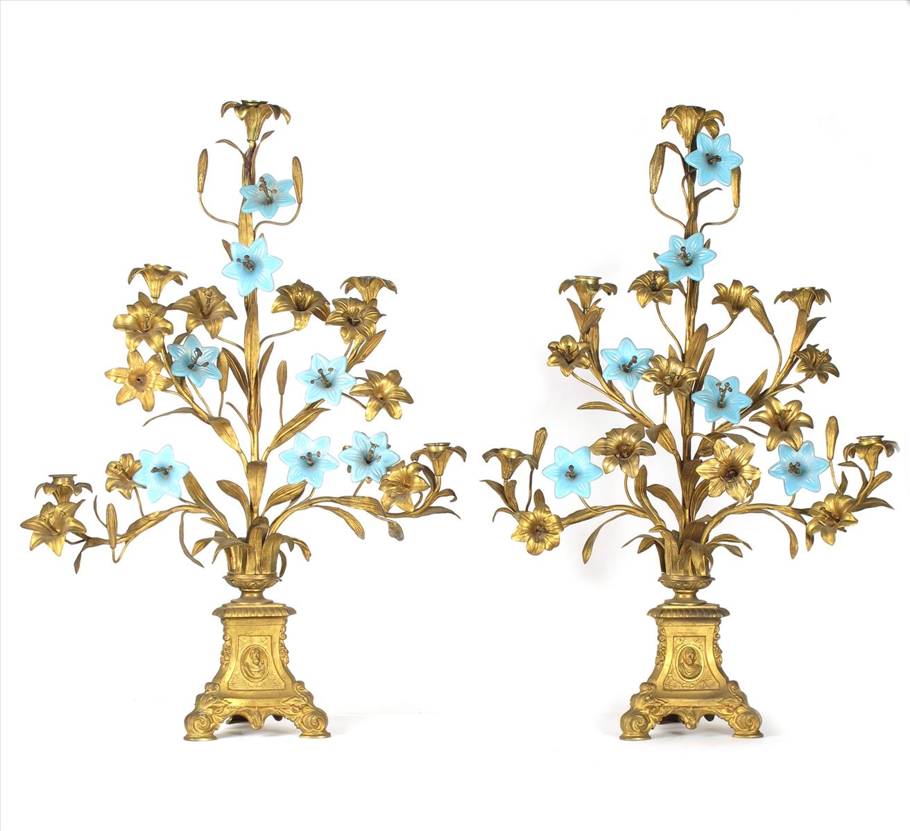 A pair of 19th century French gilt brass five light candelabra, in a form of a urn issuing flowers, some of the petals in turquoise glass, the triform base with portrait medallions, 30¼in (76.8cm) high, 19¾in (50cm) wide. (2)