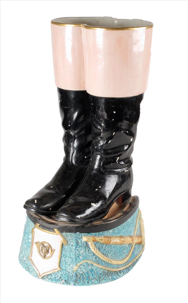A Victorian earthenware novelty hunting umbrella / stickstand, in the form of a pair of riding boots, on a horseshoe base, the base numbered '10426' and with a registration lozenge for 22nd May 1883, 21½in (54.6cm) high, 9½in (24cm) wide.