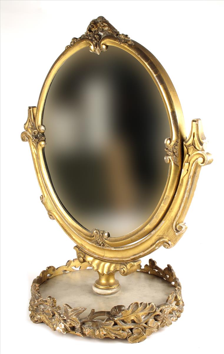A 19th century French giltwood and marble swing frame toilet mirror, 28½in (72.4cm) high, 22½in (57cm) wide.