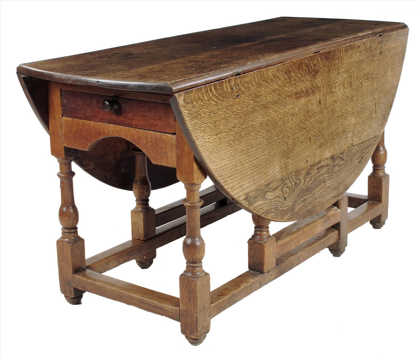 An early 18th century oak gateleg table, the oval drop-leaf top above twin end frieze drawers, 27¾in (70.5cm) high, 53½ x 56¼in (136 x 143cm).